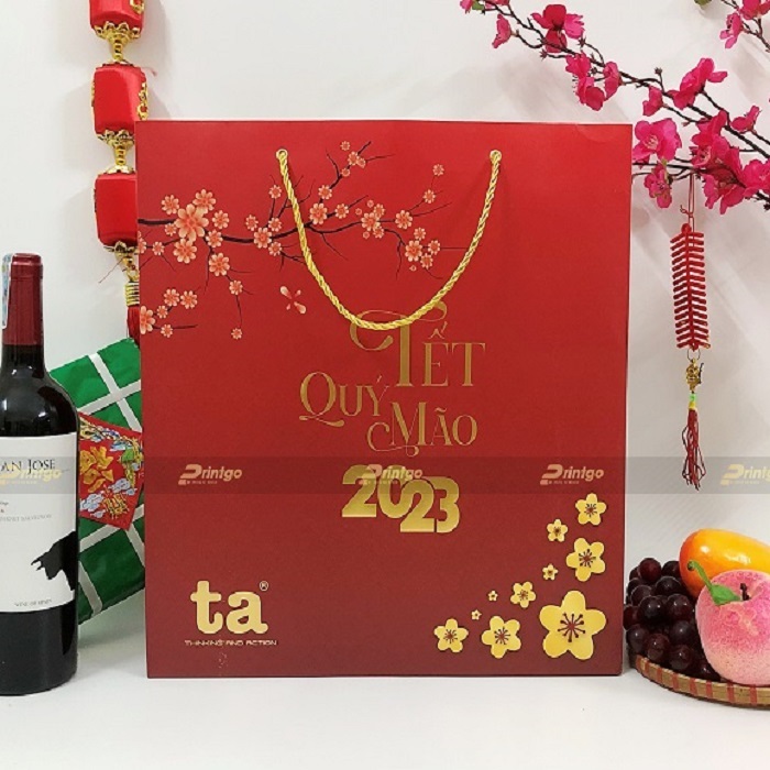 Bề mặt túi giấy PG-TQT23-11 được gia công cán bóng nhằm tăng độ bền cho túi, tăng khả năng chống thấm nước và giúp túi hạn chế nhăn rách. Phần chữ trên bề mặt túi được thực hiện ép kim vàng làm tăng thêm vẻ hiện đại của túi giấy, khi soi dưới ánh đèn bạn sẽ thấy được chúng sáng lên lấp lánh rất đẹp mắt. Túi được đục oze, xỏ dây quai tơ bóng vàng giúp người dùng thêm thuận tiện khi sử dụng. Loại giấy được lựa chọn là túi là giấy couche 300gsm đảm bảo được tính bền bỉ, dày dặn để có thể nâng, xách hộp quà tết mà không bị thủng hay rách.