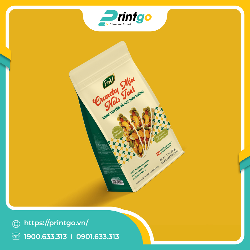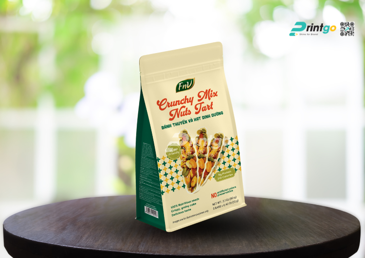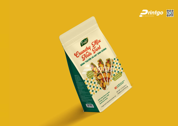 Nhu cầu về thực phẩm lành mạnh như bánh hạt, granola, ngũ cốc… đang bùng nổ kéo theo yêu cầu ngày càng cao về chất lượng và hình thức bao bì. Thị trường hiện nay ưu tiên những loại túi có khả năng bảo quản tốt, thân thiện thị giác và thuận tiện đóng gói. Hiểu được xu hướng này, Printgo tự hào giới thiệu mẫu túi hàn biên đựng hạt dinh dưỡng FnV Foods với thiết kế cao cấp cùng khart năng tối ưu trải nghiệm, giúp nâng tầm giá trị của thương hiệu bạn.
