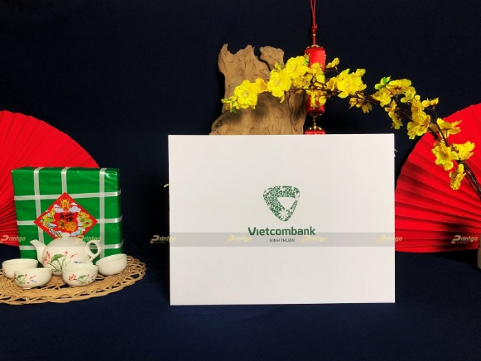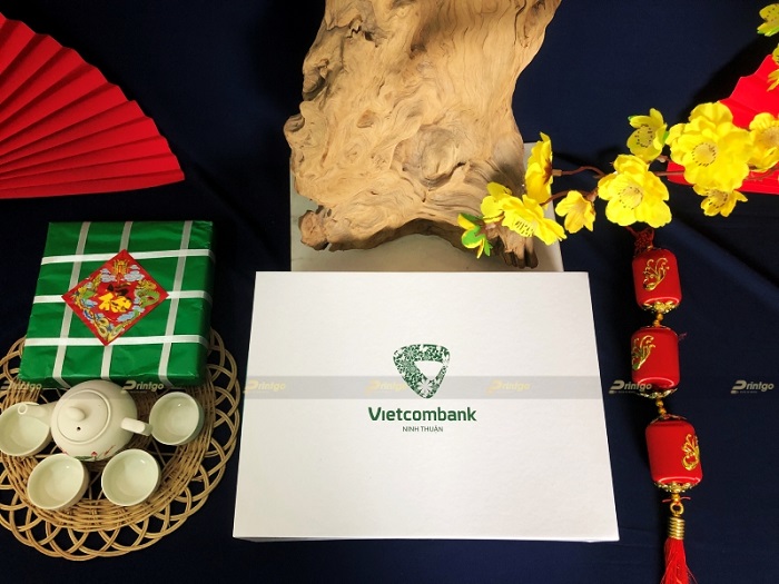 Hình ảnh chụp thực tết hộp quà tết Vietcombank Ninh Thuận được thực hiện bởi Printgo: