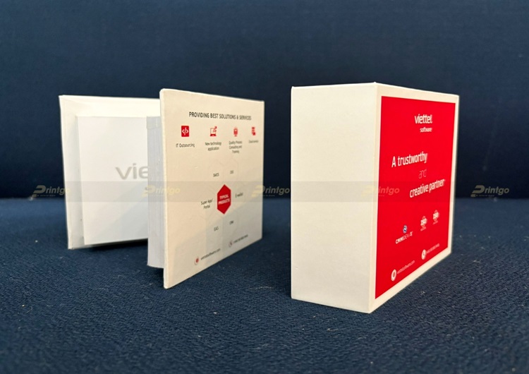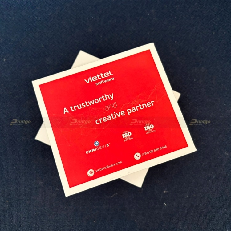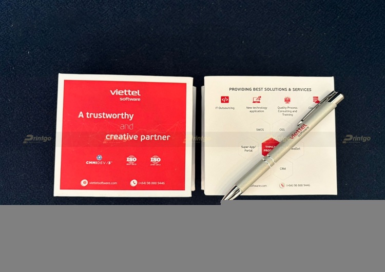 Printgo với giải pháp cuốn sổ tay ghi chú - sổ note, cuốn sổ này sẽ được sử dụng như “bộ não thứ hai" của mỗi người. Nhờ ghi chú lại những sự kiện, nội dung quan trọng mà có thể giúp chúng ra làm việc, học tập hiệu quả hơn, không những thế còn có thể tạo ấn tượng tốt cho người xung quanh. Cuốn sổ được thiết kế đặc biệt, không giống bất cứ cuốn sổ nào trên thị trường hiện nay. Tất cả thông tin về thương hiệu Viettel Software Services được khéo léo thiết kế trên toàn bộ cuốn sổ, nhưng đầy đủ và ấn tượng nhất chính là các trang bìa. Ở bìa trước, ưu tiên xuất hiện các thông tin cơ bản về thương hiệu như Tên thương hiệu Viettel Software, các thông tin liên lạc như website, hotline. Đặc biệt thông điệp mà doanh nghiệp muốn truyền tải chính là A trustworthy and creative partner: Là một đối tác tin cậy và sáng tạo. Phía dưới là các tiêu chuẩn CMMI DEV / 3, ISO 9001:2015, ISO 27001:2013 là những công nhận đáng tự hào cho năng lực phát triển phần mềm và hệ thống quản lý chất lượng theo chuẩn mực quốc tế của thương hiệu, minh chứng cho thông điệp mà thương hiệu muốn truyền tải.