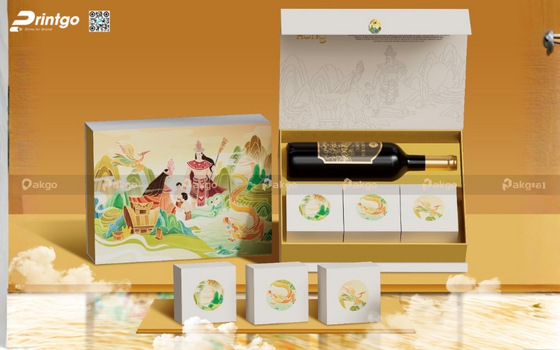 Đi sâu vào thiết kế, hộp quà nổi bật với họa tiết hòa quyện giữa vân phương Đông và đường nét hiện đại, kết hợp ép kim sáng bóng và phủ UV tạo hiệu ứng ánh lên lung linh, sống động khi nhìn nghiêng. Bên trong, khay rượu cố định được bố trí tinh tế, vừa đảm bảo an toàn cho sản phẩm, vừa nâng tầm trải nghiệm khi nhận quà, giúp món quà trở nên hoàn thiện và đáng trân trọng hơn bao giờ hết.
