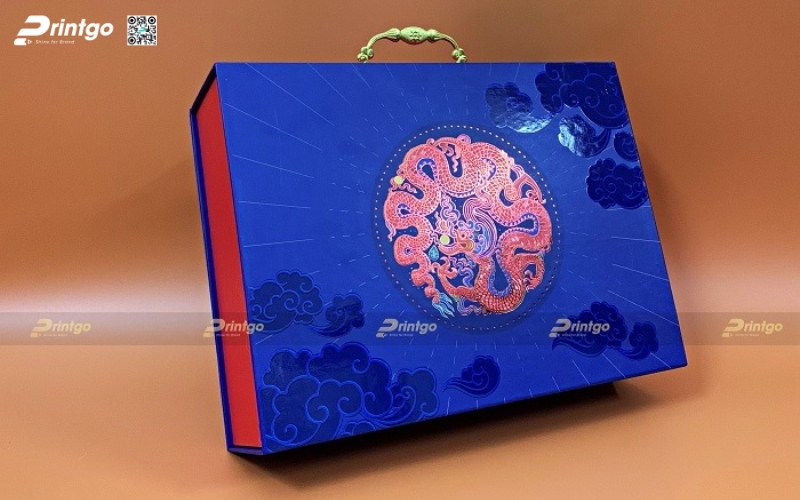Thiết kế nổi bật với kỹ thuật ép kim và phủ UV, giúp họa tiết rồng ánh lên lấp lánh, mang hiệu ứng chuyển động như đang uốn lượn trong không trung. Cấu trúc hộp nắp lật nam châm kèm quai xách kim loại chắc chắn vừa thuận tiện mang tặng, vừa nâng tầm đẳng cấp món quà.
