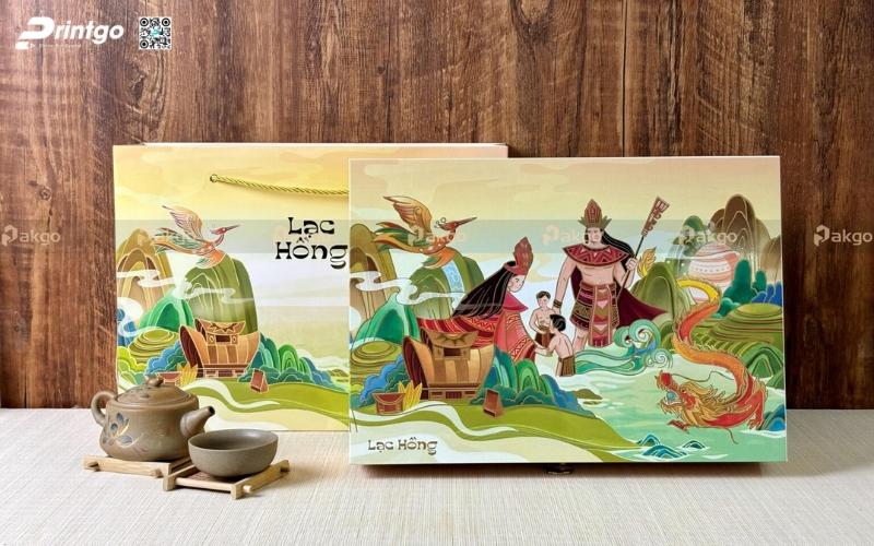 Lạc Hồng khay rượu là mẫu hộp quà Tết đậm bản sắc dân tộc Việt, lấy cảm hứng từ truyền thuyết “Con Rồng Cháu Tiên”. Ngay từ ánh nhìn đầu tiên, tông vàng - xanh chủ đạo kết hợp hình ảnh Rồng Tiên, chim Lạc, sông núi tái hiện vẻ đẹp rực rỡ của cội nguồn, tạo cảm giác thịnh vượng, an lành và tự hào dân tộc.
