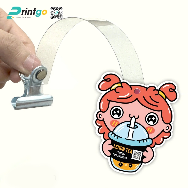 Về kích thước, wobbler không bị giới hạn theo khuôn mẫu cố định. Kích thước phổ biến thường dao động trong khoảng từ 7 x 10 cm đến 15 x 20 cm, tuy nhiên các doanh nghiệp hoàn toàn có thể đặt thiết kế riêng để phù hợp với nhu cầu trưng bày, không gian bán hàng hoặc chiến dịch truyền thông cụ thể.
