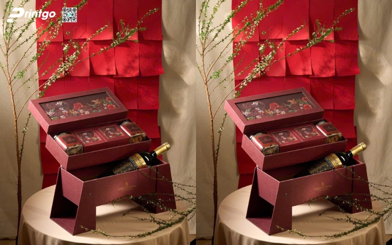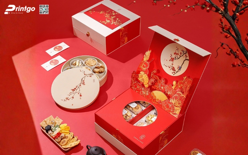 Một xu hướng nổi bật khác là hộp quà kết hợp tinh hoa truyền thống và phong cách hiện đại. Những thiết kế này vẫn giữ hình ảnh Tết Việt như hoa mai, hoa đào, câu đối đỏ nhưng được biến tấu tinh tế, hiện đại hơn, phù hợp với thị hiếu ngày nay. Món quà vừa truyền thống vừa trẻ trung sẽ tạo cảm giác gần gũi mà vẫn sang trọng.