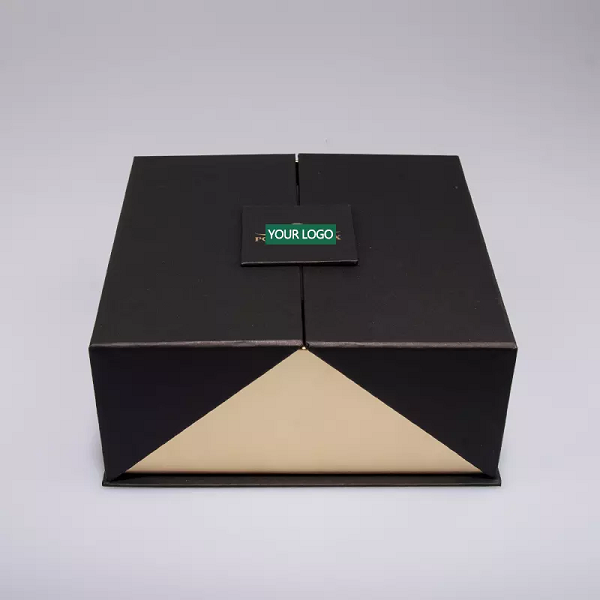 Mẫu hộp mở nắp cánh bướm với logo thiết kế ép kim nổi bật ở giữa