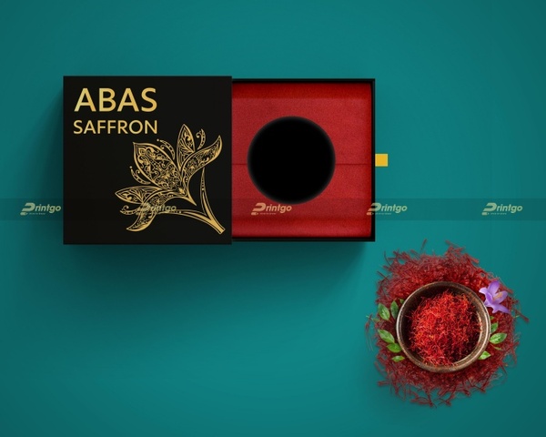 Mẫu hộp thảo dược nhụy hoa nghệ tây Abas Saffron, ép kim tên logo, sản phẩm và hoạt tiết nổi bật, sang trọng