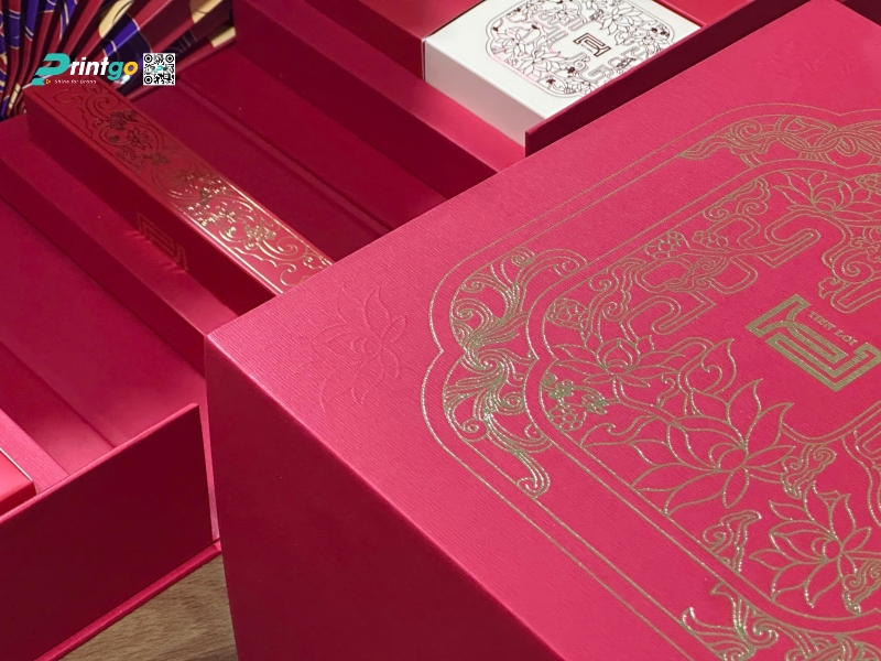 Gia công sau in là bước nâng tầm giá trị cho hộp quà Tết. Các kỹ thuật như ép kim tạo hiệu ứng sang trọng; dập nổi – dập chìm tạo chiều sâu thị giác; UV định hình làm nổi bật chi tiết chủ đạo; lăn vân tạo cảm giác chạm tinh tế phù hợp với bộ hộp cao cấp.