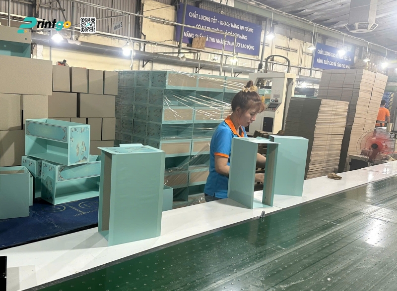 Khi đặt in tại xưởng chuyên nghiệp như Printgo, doanh nghiệp được tư vấn chi tiết về định lượng giấy, quy hộp và kỹ thuật gia công phù hợp từng dòng sản phẩm, hạn chế tối đa lỗi size hoặc form hộp không đạt.