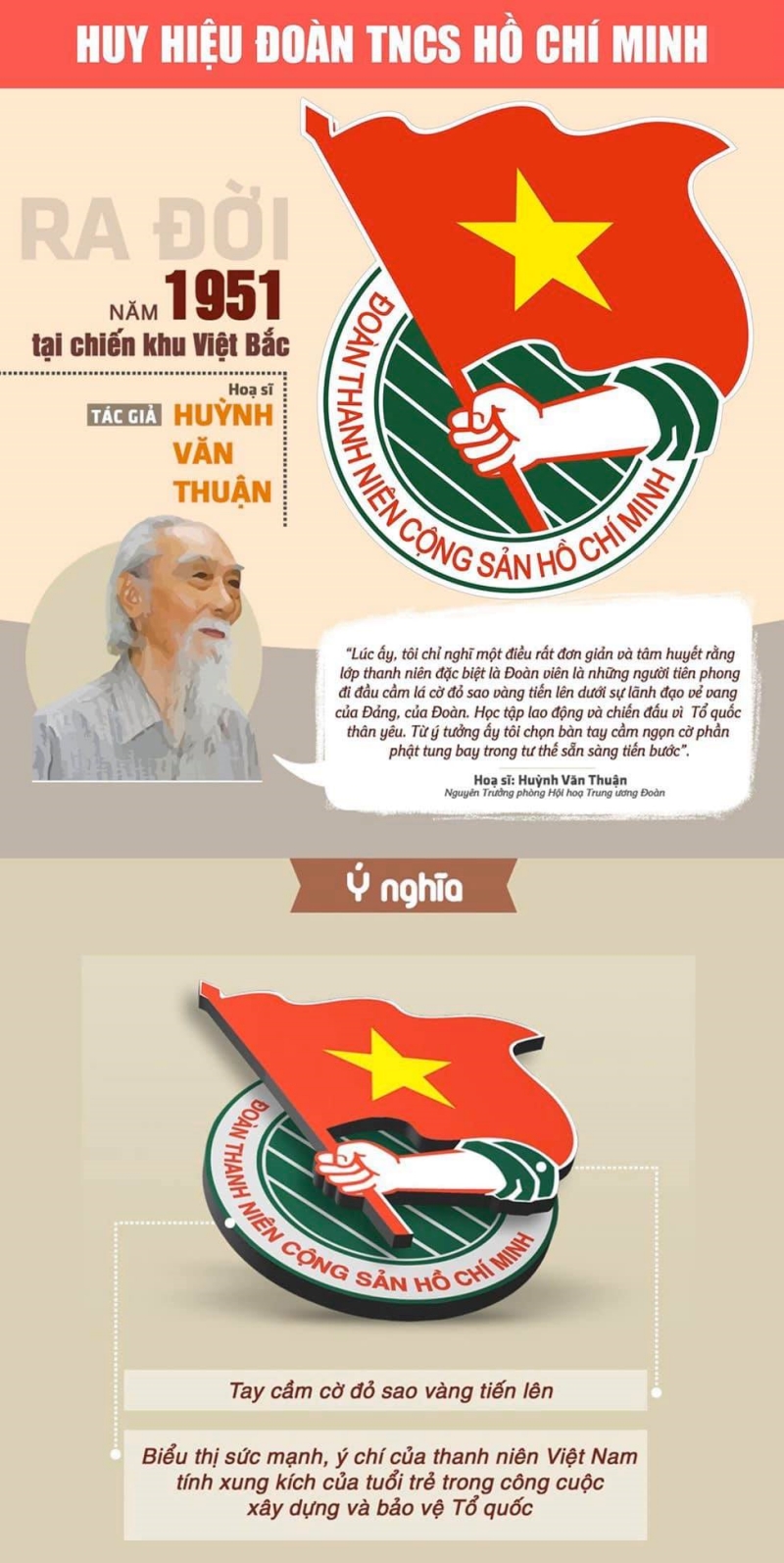 Cùng với sự phát triển của tổ chức Đoàn, biểu tượng logo Đoàn Thanh niên Cộng sản Hồ Chí Minh cũng được ra đời nhằm thể hiện tinh thần đoàn kết và sức mạnh của tuổi trẻ Việt Nam. Năm 1951, tại Đại hội Thanh niên tổ chức ở Việt Bắc, Trung ương Đoàn đã giao nhiệm vụ cho họa sĩ Huỳnh Văn Thuận cùng họa sĩ Tôn Đức Lượng thiết kế biểu tượng chính thức cho tổ chức. Mẫu logo với hình ảnh cánh tay thanh niên cầm lá cờ Tổ quốc tung bay đã được lựa chọn và sử dụng làm biểu tượng chính thức của Đoàn Thanh niên Cộng sản Hồ Chí Minh cho đến ngày nay.