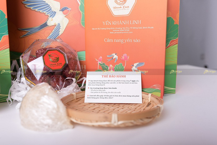 Logo của thương hiệu cũng được in rõ nét để khách hàng có thể nhớ đến và nhận diện thương hiệu. Bên trong sản phẩm cũng có thư cảm ơn của thương hiệu đến với các khách hàng. Đặc biệt thương hiệu Yến Khánh Linh còn có phiếu bảo hành đối với sản phẩm. Điều này chứng tỏ chất lượng của sản phẩm rất tốt và được bảo quản cẩn thận.